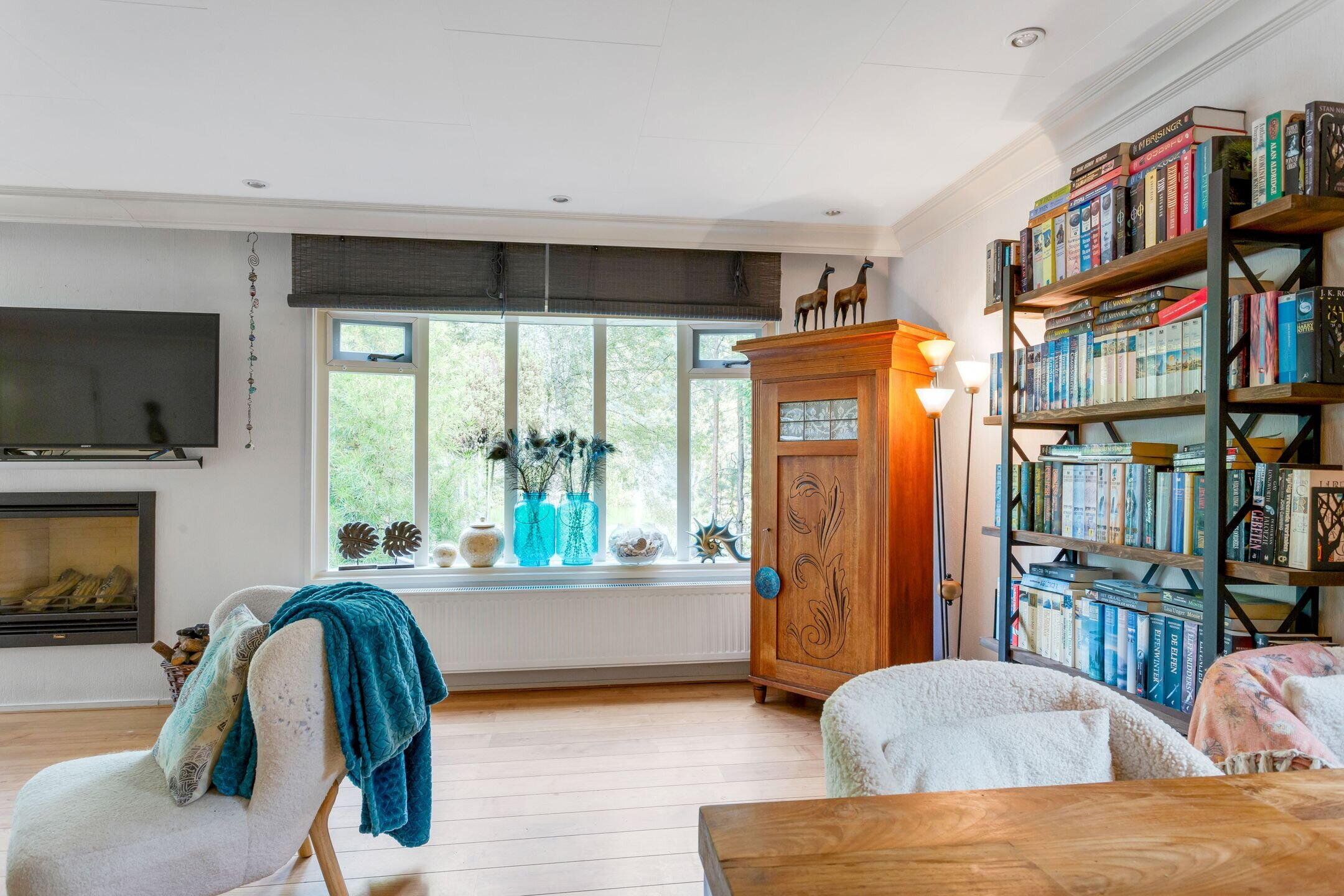 - Woonkamer met schuifpui, airco (koelen & verwarmen) en Faber gashaard
